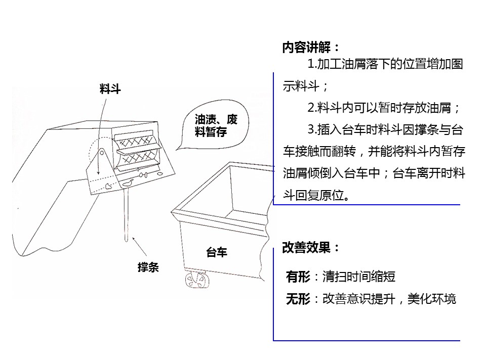 问题描述:更换废屑台车时,废屑排除口处会有残存油渍滴下,污染地面。