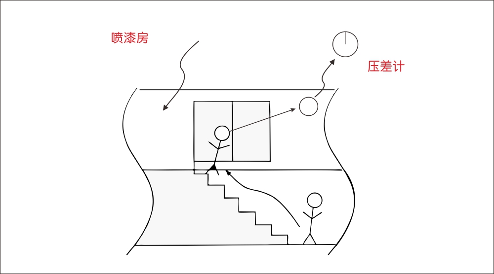 一般都是通过压差计来目视确认喷漆房内的气压是否比外部气压高,因为离远了看不到,所以确认时需要登上台阶走到跟前才能看到。